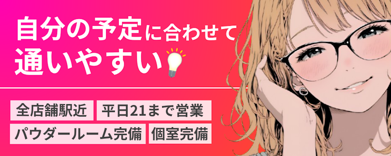 フレイアクリニックは当日キャンセルが1回まで無料でできるため、急な体調不良や予定が入ってしまった場合でも安心です。さらに平日は21時まで営業しており全店舗駅チカと通いやすい環境が整っています。パウダールームも完備で自分の予定に合わせて通いやすい!!
